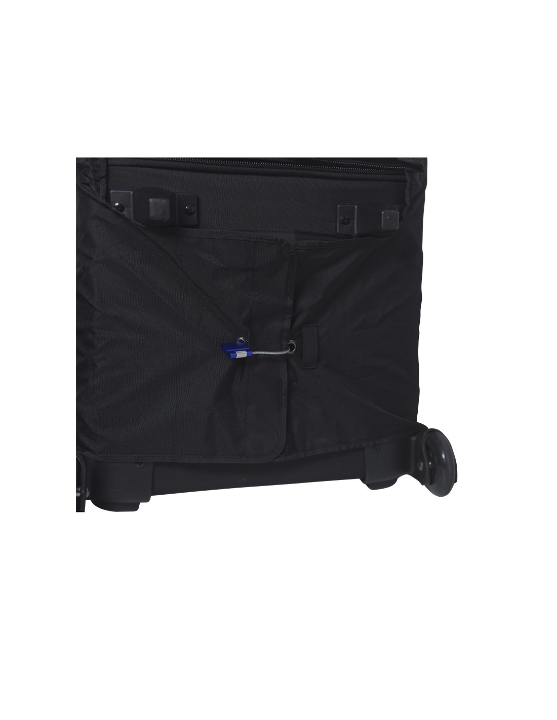 La housse est équipée d’un système de serrage par boucle à ressort permettant d’ajuster précisément le diamètre pour un maintien sécurisé. Deux ouvertures supérieures spécifiques permettent le passage de la poignée trolley sans retirer la protection, tandis qu’une poche filet externe est prévue pour insérer une étiquette ou une carte de visite. Pratique, la housse se replie dans une petite pochette pour un rangement facile et est livrée avec un Digits Locker inclus.