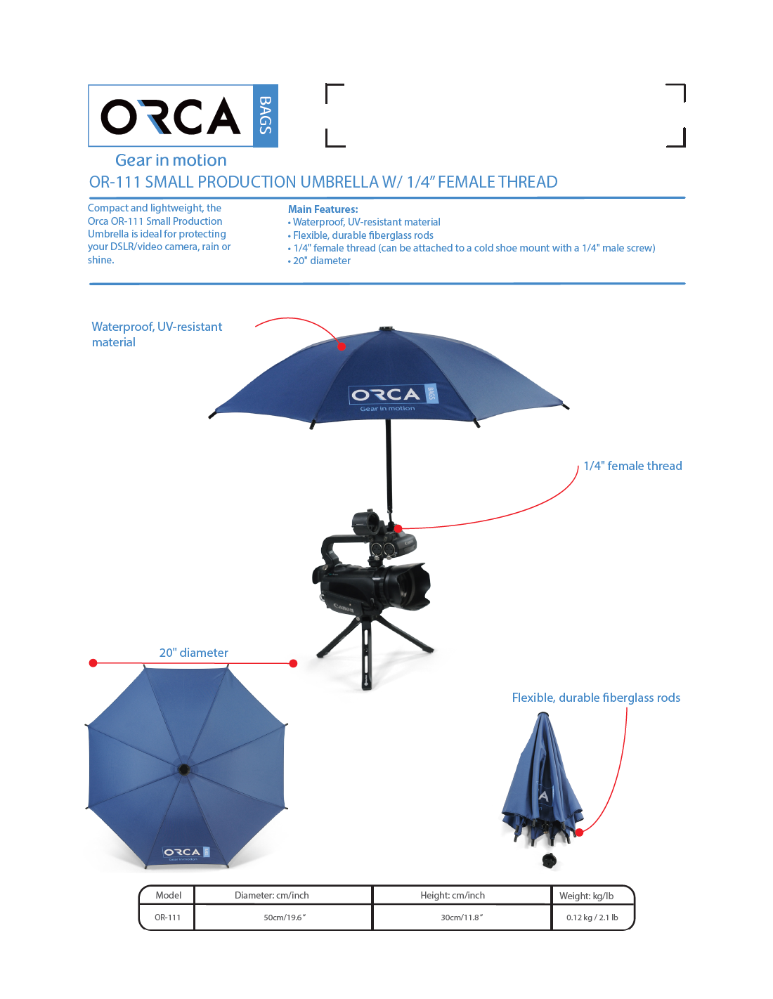 Le parapluie de production ORCA OR-111 est une solution compacte et professionnelle pour protéger le matériel audiovisuel contre la pluie et l’exposition directe au soleil lors des tournages. Conçu pour un usage mobile, il associe un textile imperméable et résistant aux UV à une structure en tiges de fibre de verre flexibles et durables, garantissant une bonne tenue face aux conditions extérieures.
