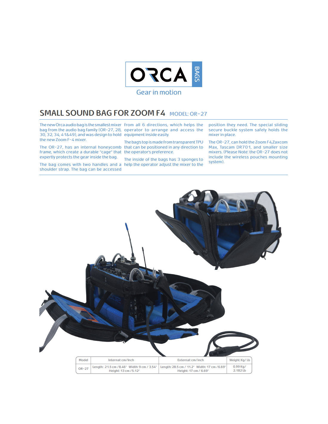 La sacoche ORCA OR-27 Small Audio Mixer Bag fait partie des modèles les plus compacts de la gamme ORCA et a été développée pour les professionnels du son utilisant des enregistreurs portables tels que le Zoom F4, Zaxcom Max, Tascam DR-701D ou modèles de dimensions similaires. Sa structure interne en nid d’abeille assure une protection efficace du matériel tout en conservant un format léger et maniable.