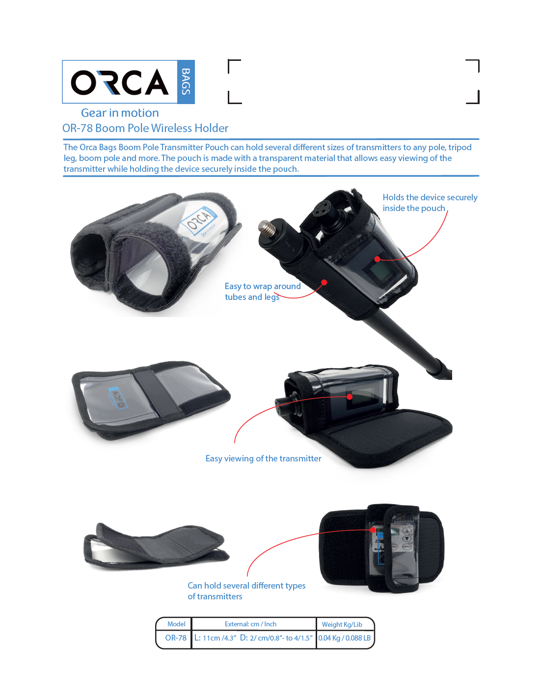 La ORCA OR-78 Boom Pole Wireless Holder a été développée pour permettre aux preneurs de son de fixer facilement un émetteur HF directement sur une perche micro, un trépied ou tout support tubulaire.