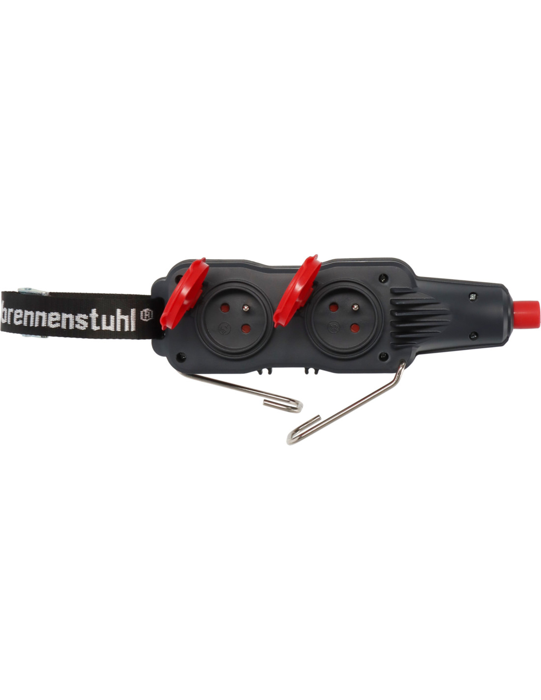 Les crochets métalliques rabattables permettent une fixation directe sur un échafaudage, un portique lumière ou une structure plateau, tandis que la sangle intégrée assure un rangement propre du câble.