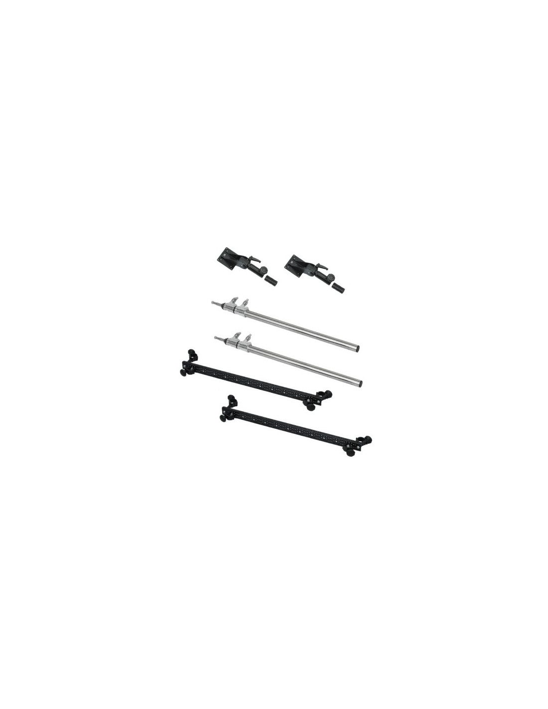 La barre transversale en acier robuste, équipée de nombreux perçages, permet non seulement de sécuriser l’installation mais aussi d’ajouter des accessoires (lumières, bras articulés, etc.). L’ensemble se monte facilement avec les quatre colliers de serrage fournis, garantissant une stabilité optimale.