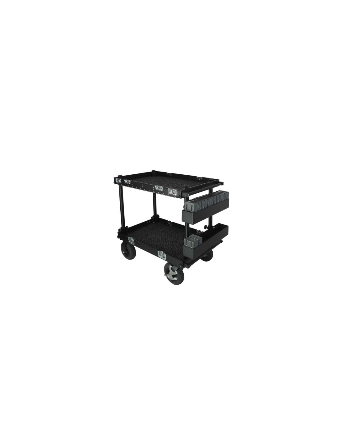 Sa structure en aluminium à parois renforcées empêche toute déformation, même en conditions de transport intensives. Le système de fixation par deux colliers 40 mm permet de l’installer directement sur les tubes verticaux reliant les étagères d’une roulante Smartone. Cette position offre un gain d’espace significatif tout en maintenant les batteries à portée de main.