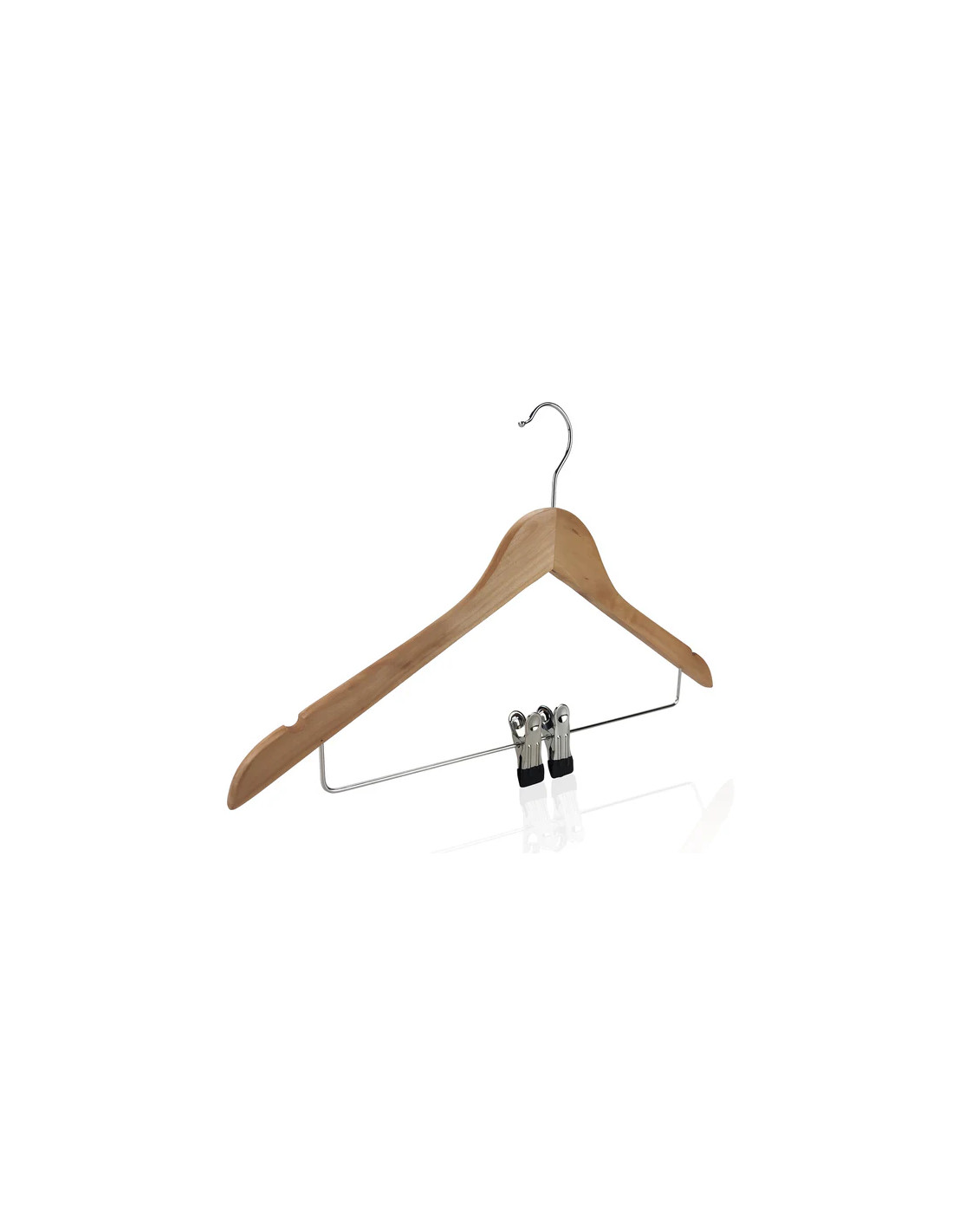 Chaque cintre, en bois finition naturelle, dispose d’encoches latérales pour suspendre robes, tops ou pièces à bretelles, ainsi que de deux pinces robustes permettant d’accrocher jupes, pantalons ou ensembles complets.
