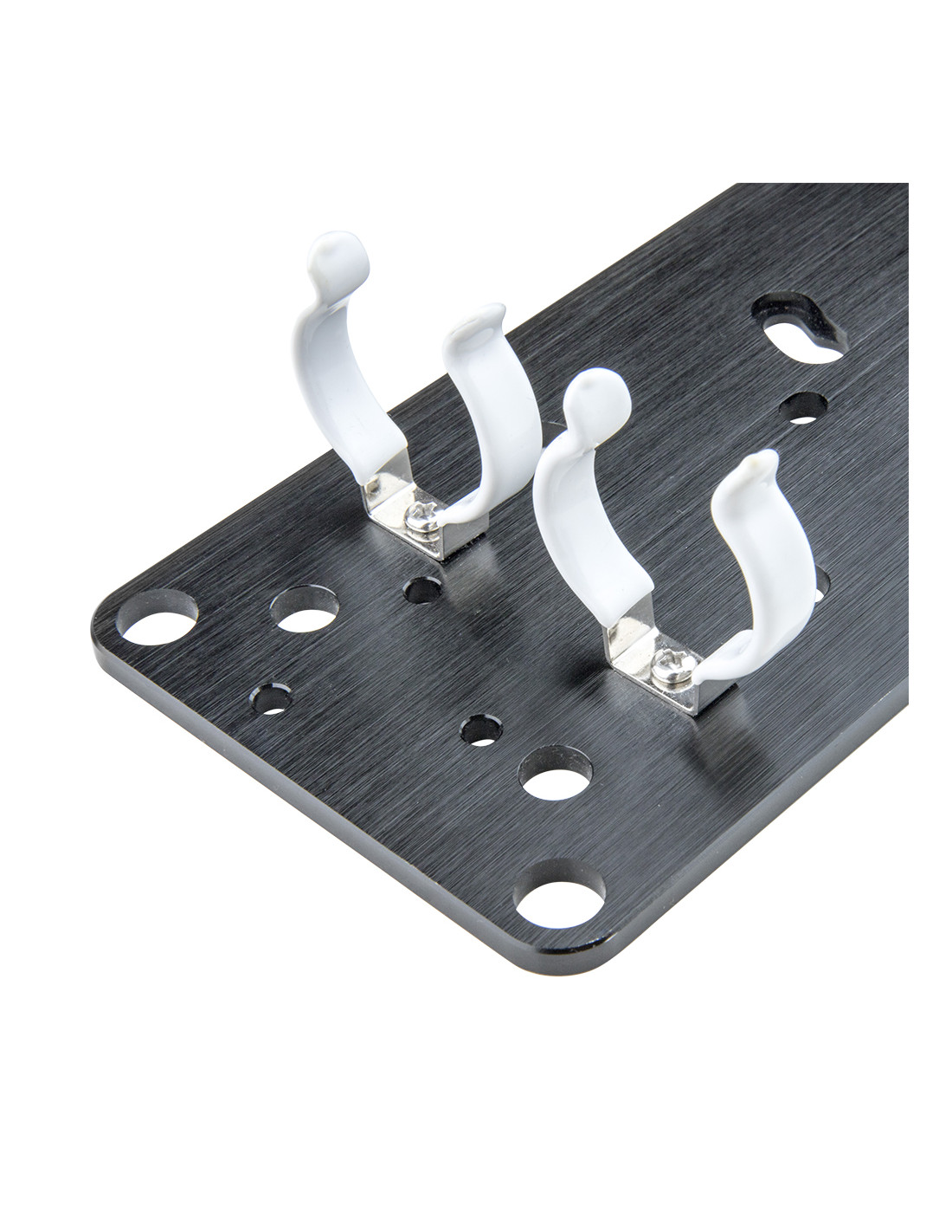 La plaque de fixation KUPO Twist-Lock est fabriquée en aluminium anodisé noir et équipée de deux paires de clips à ressort en acier avec revêtement caoutchouté blanc, garantissant un maintien ferme et une protection optimale des tubes lumineux.