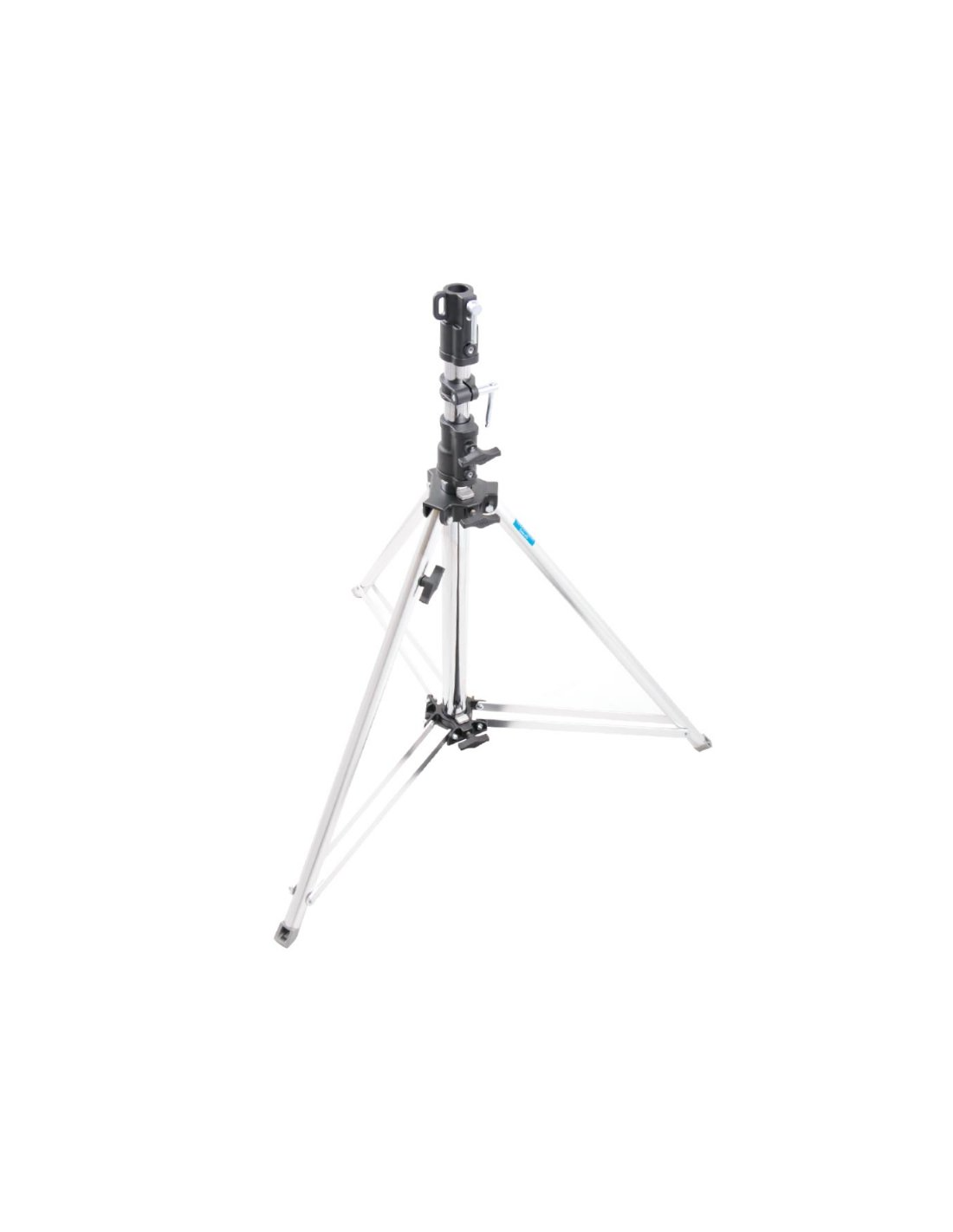 Trépied KUPO U126 en acier, 2 sections, hauteur réglable de 92 à 147 cm, capacité de charge 40 kg, avec pied de nivellement, collier de mémoire et colonne centrale chromée. Idéal pour projecteurs follow spot et équipements lourds.