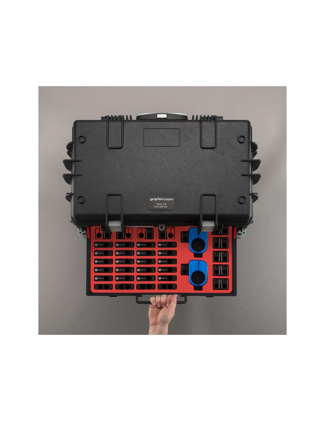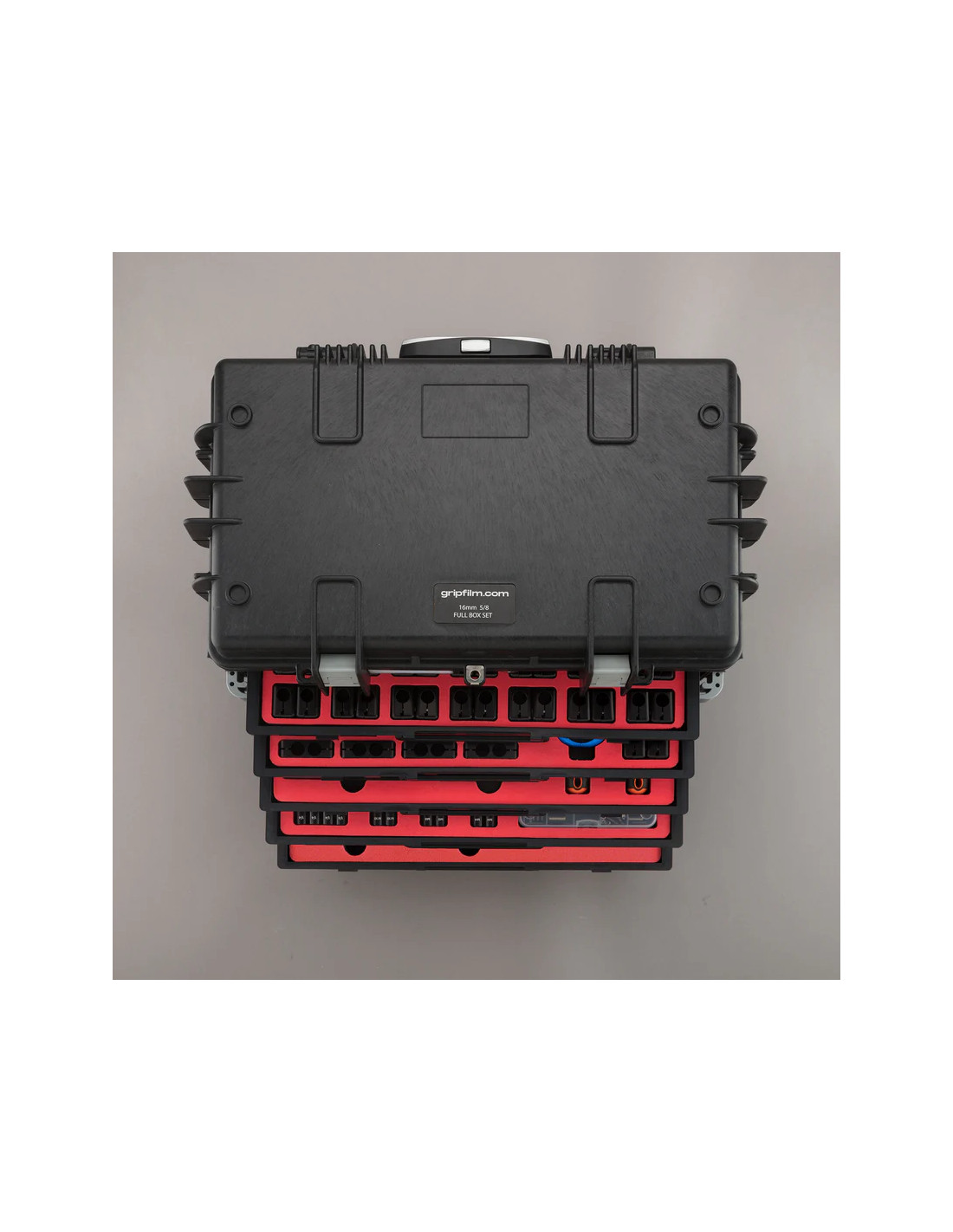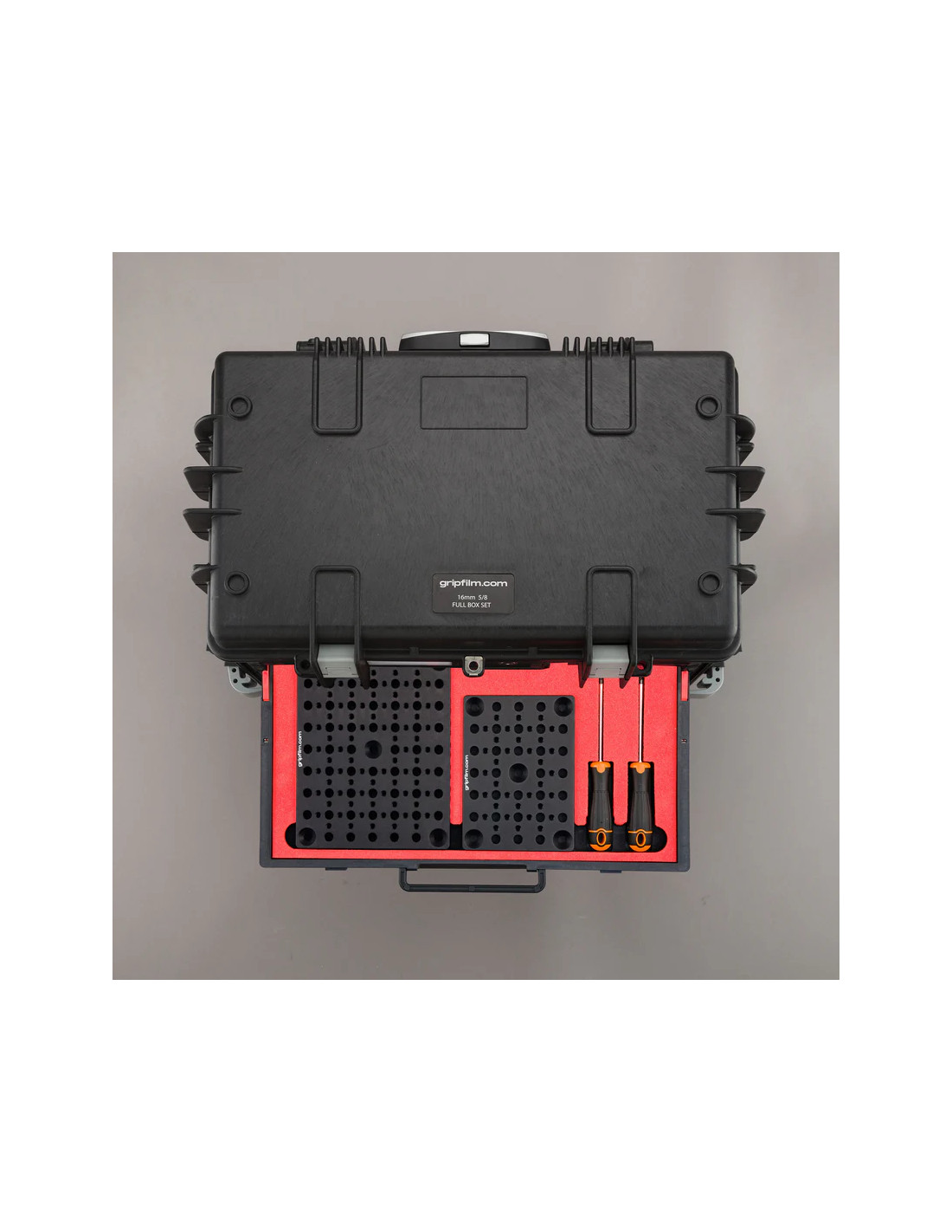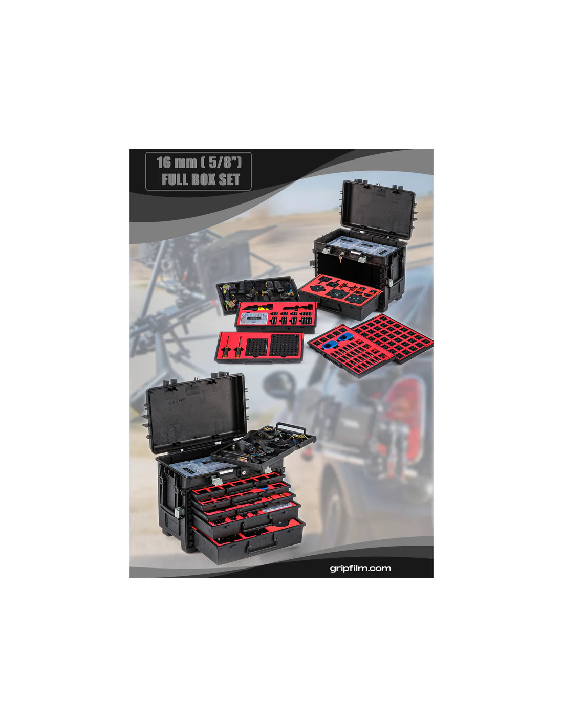 Le Full Box Set 16 mm contient un ensemble de pièces de fixation compatibles 16 mm et 48,3 mm (1"1/2), en aluminium anodisé haute résistance et en acier inoxydable. Chaque élément est soigneusement rangé dans une mousse découpée sur mesure pour un transport sécurisé et un accès rapide sur les tournages. Idéal pour les régisseurs et techniciens grip à la recherche d’un kit complet, fiable et bien organisé.