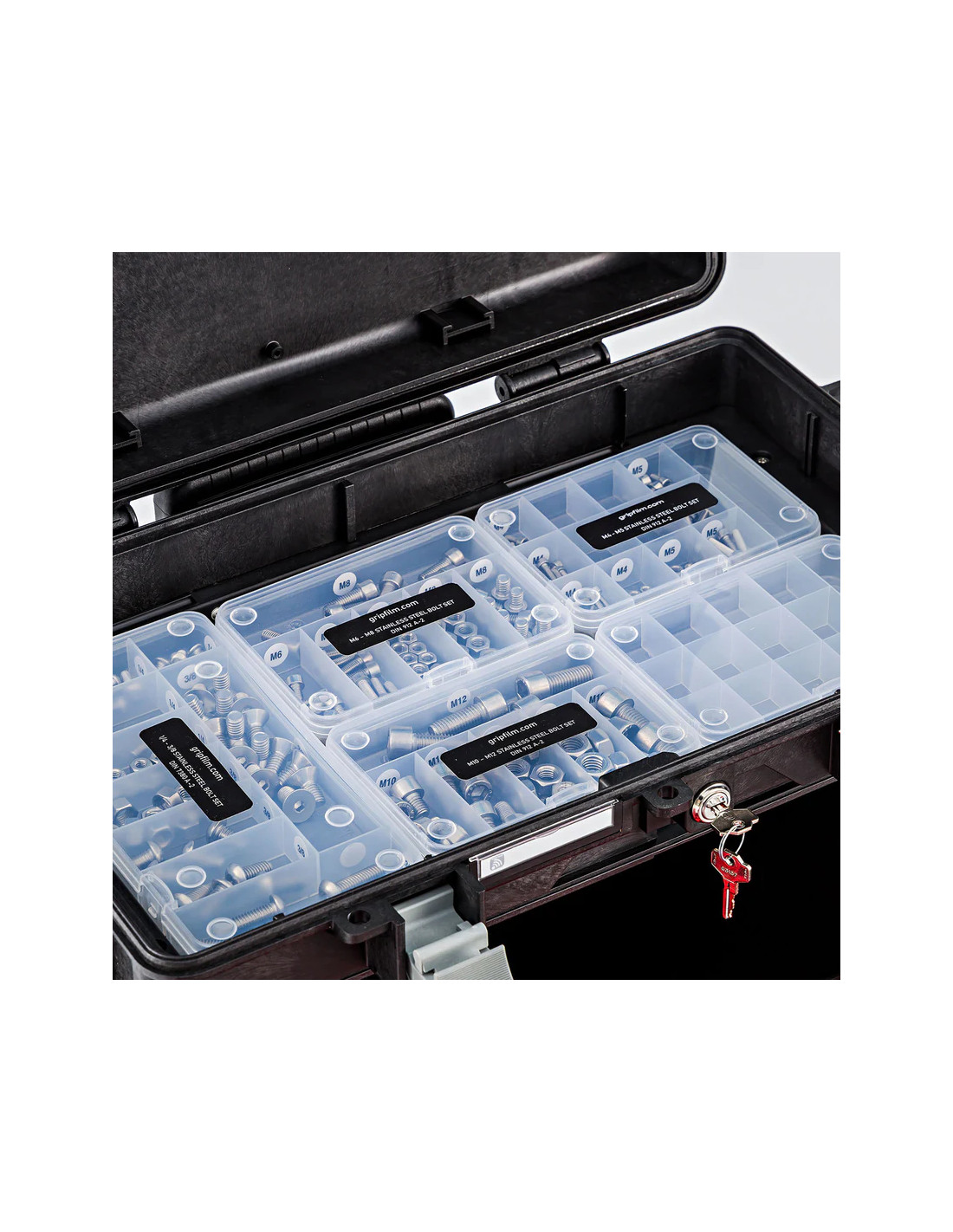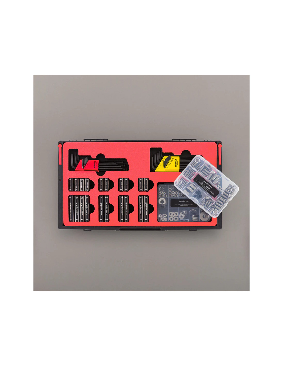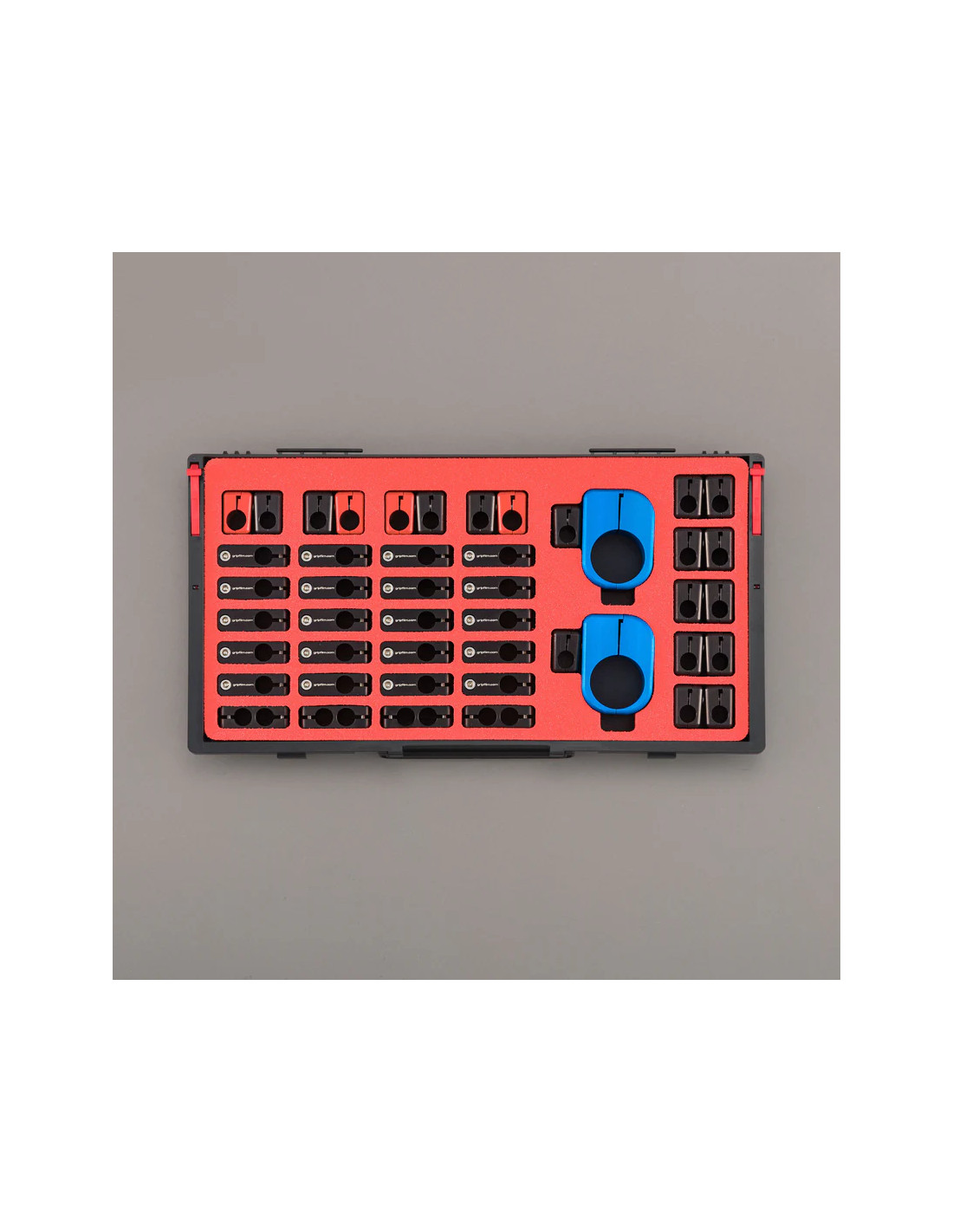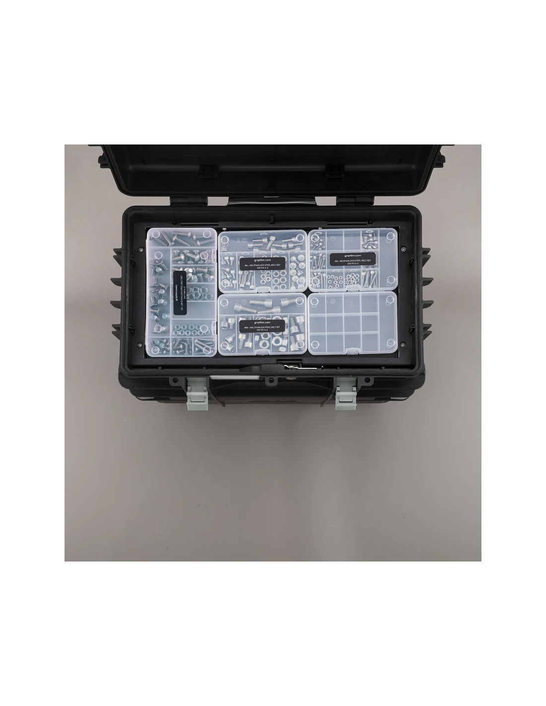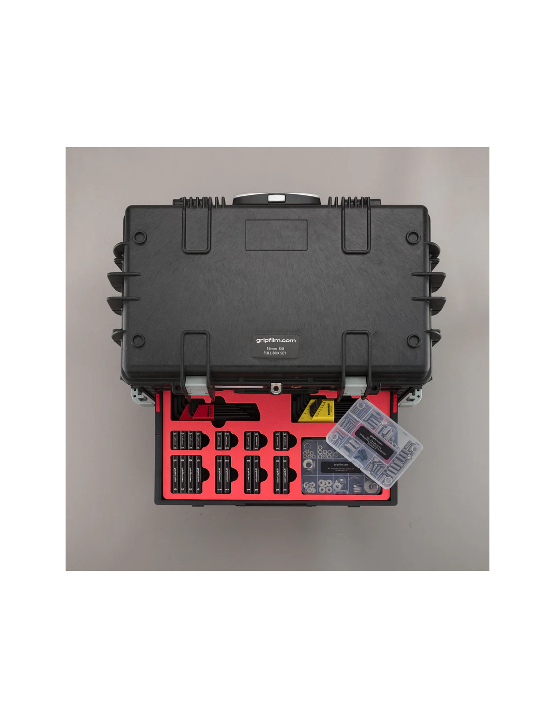 Le Full Box Set 16 mm contient un ensemble de pièces de fixation compatibles 16 mm et 48,3 mm (1"1/2), en aluminium anodisé haute résistance et en acier inoxydable. Chaque élément est soigneusement rangé dans une mousse découpée sur mesure pour un transport sécurisé et un accès rapide sur les tournages. Idéal pour les régisseurs et techniciens grip à la recherche d’un kit complet, fiable et bien organisé.