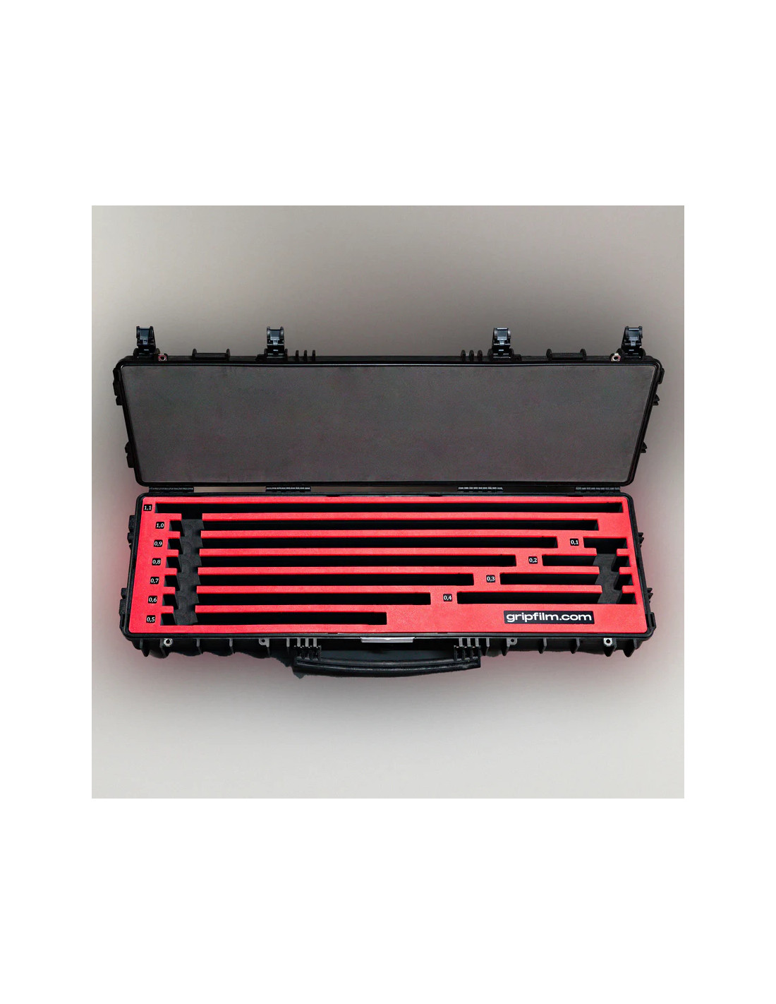 Spécialement pensée pour le transport sécurisé de barres aluminium 16 mm, cette valise rigide est dotée d’une mousse découpée au laser avec un espace dédié à 10 barres pour chaque longueur standard (de 100 mm à 1100 mm). Chaque compartiment est étiqueté pour une identification rapide. La valise ne contient pas de barres — elle constitue l’accessoire parfait pour compléter un set de rigging ou remplacer une valise usée. Robuste et ergonomique, elle supporte une utilisation intensive sur les tournages.