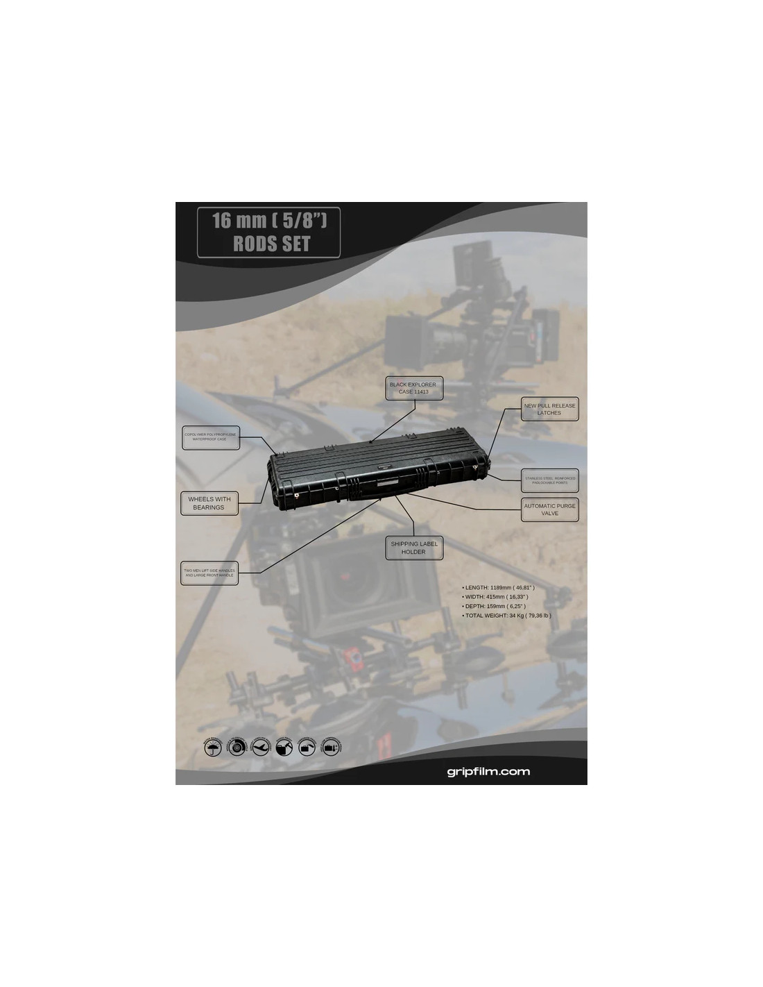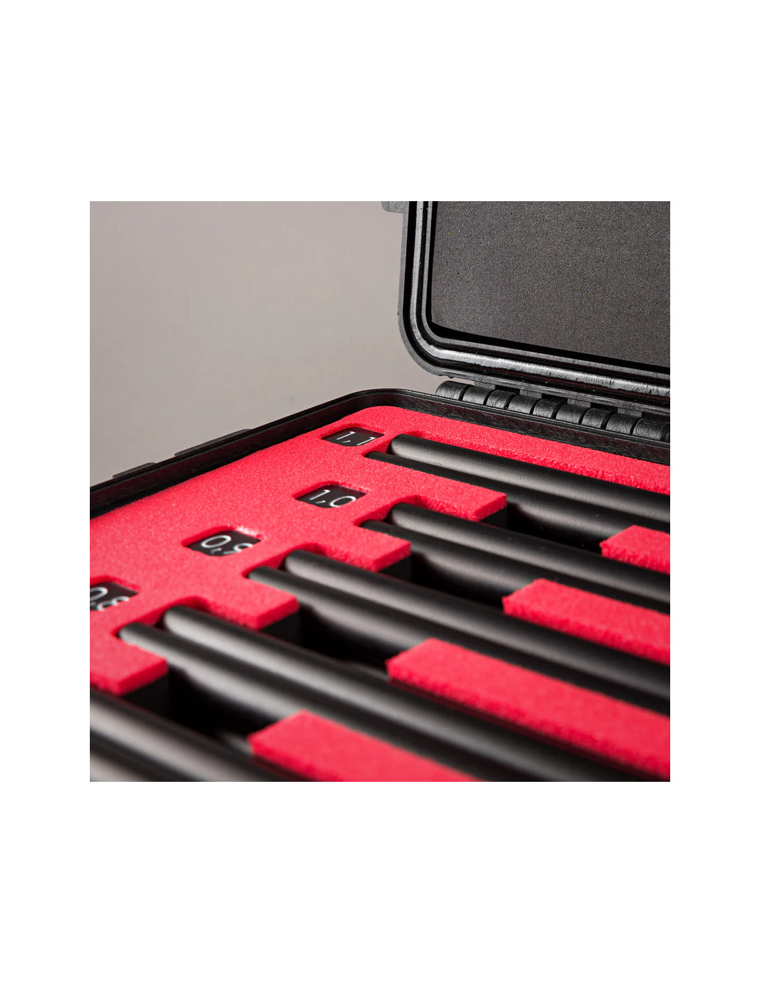 Le coffret complet de tiges de précision Ø16 mm (5/8”) est une solution haut de gamme et prête à l'emploi pour les professionnels du cinéma, de la régie et de la machinerie. Il contient 110 tiges creuses en aluminium de longueurs croissantes (de 100 mm à 1100 mm), rangées dans une valise Explorer ultra résistante, avec mousse noire et rouge découpée au laser et étiquetage individuel pour une identification rapide.