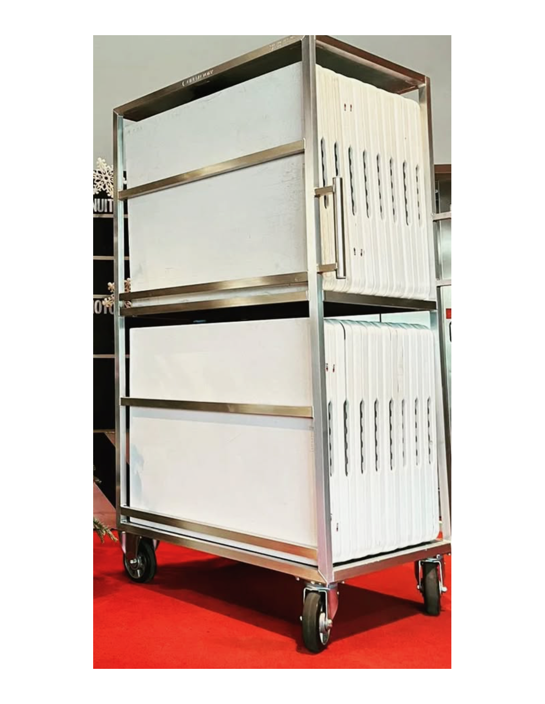 Chariot pratique et robuste, idéal pour stocker et déplacer facilement de grandes tables de régie sur les plateaux de tournage.