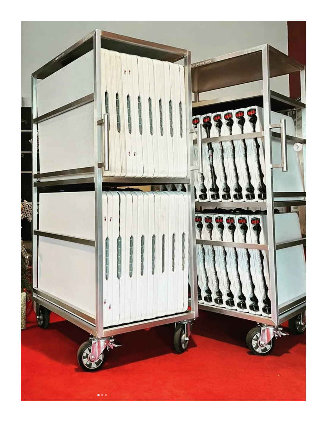 Roulante grande table régie Cinefactory, conçue pour transporter jusqu'à 16 tables de 180 cm.