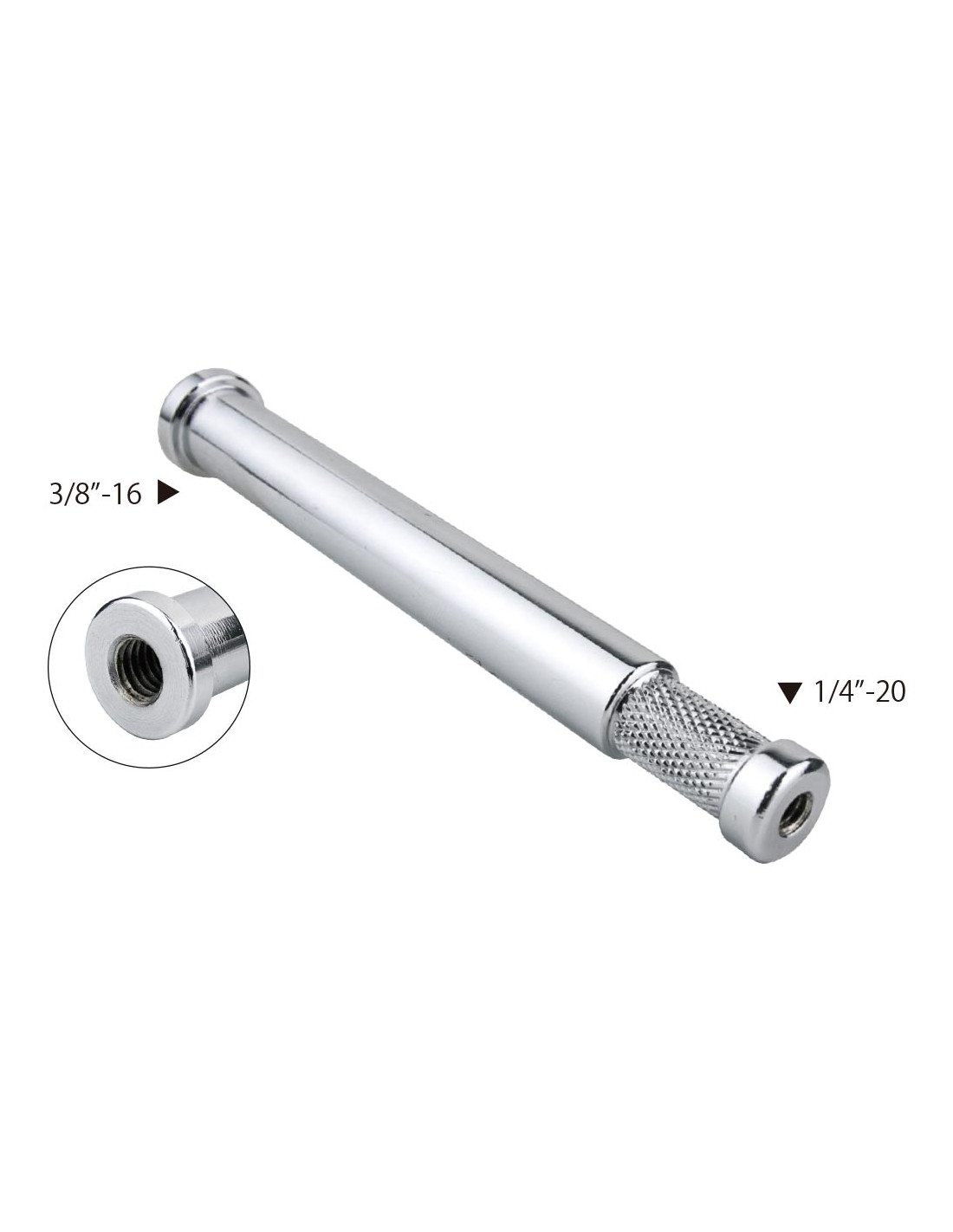 Longue de 12,7 cm (5"), elle comprend un spigot 16 mm avec doubles filetages internes 1/4"-20 et 3/8"-16, offrant une compatibilité étendue avec la plupart des accessoires d’éclairage.