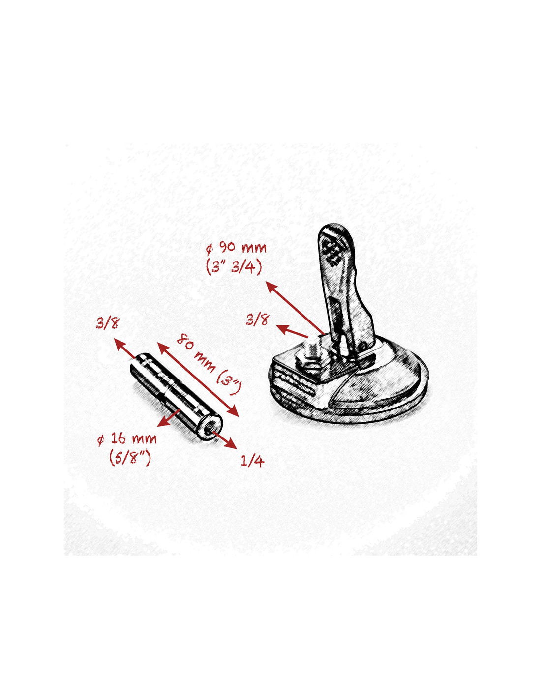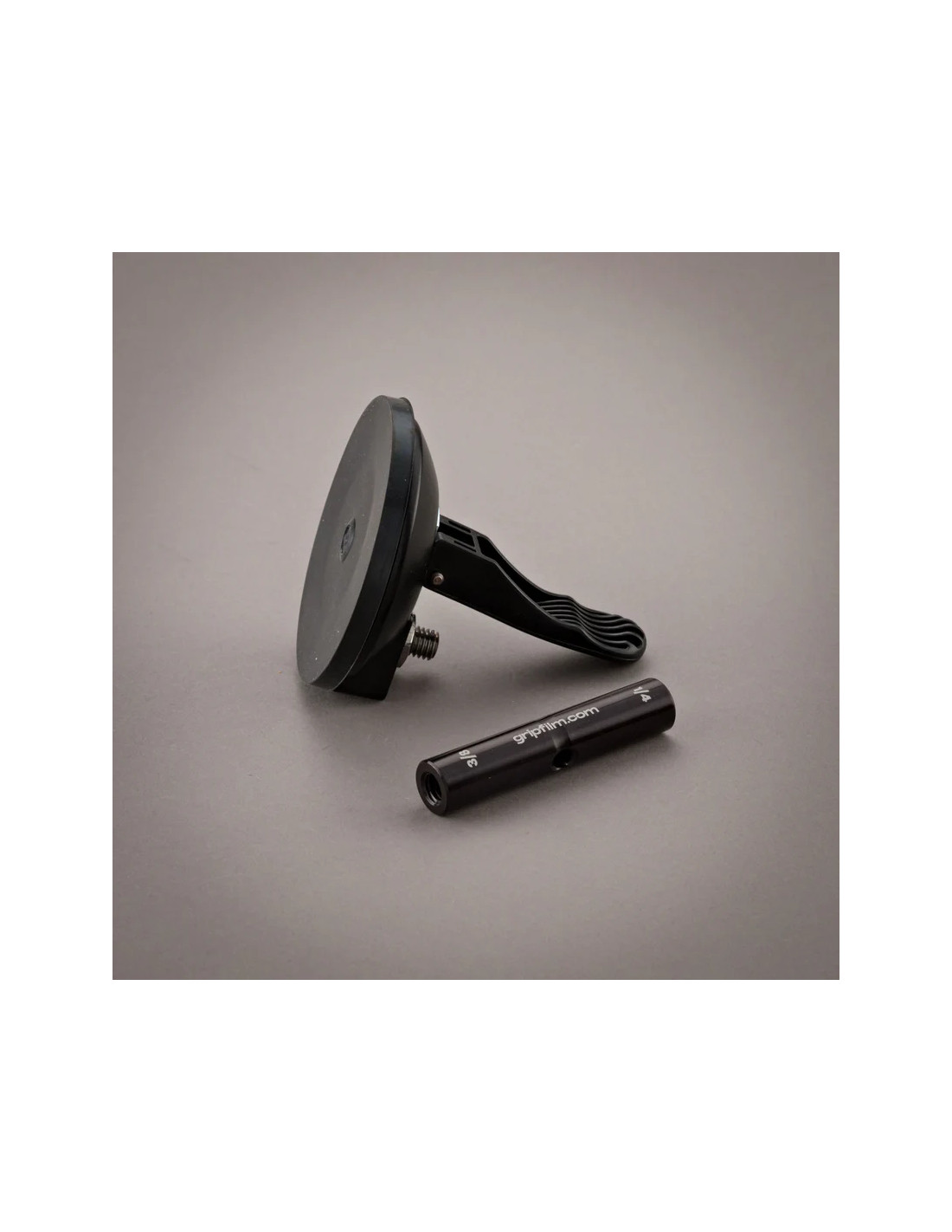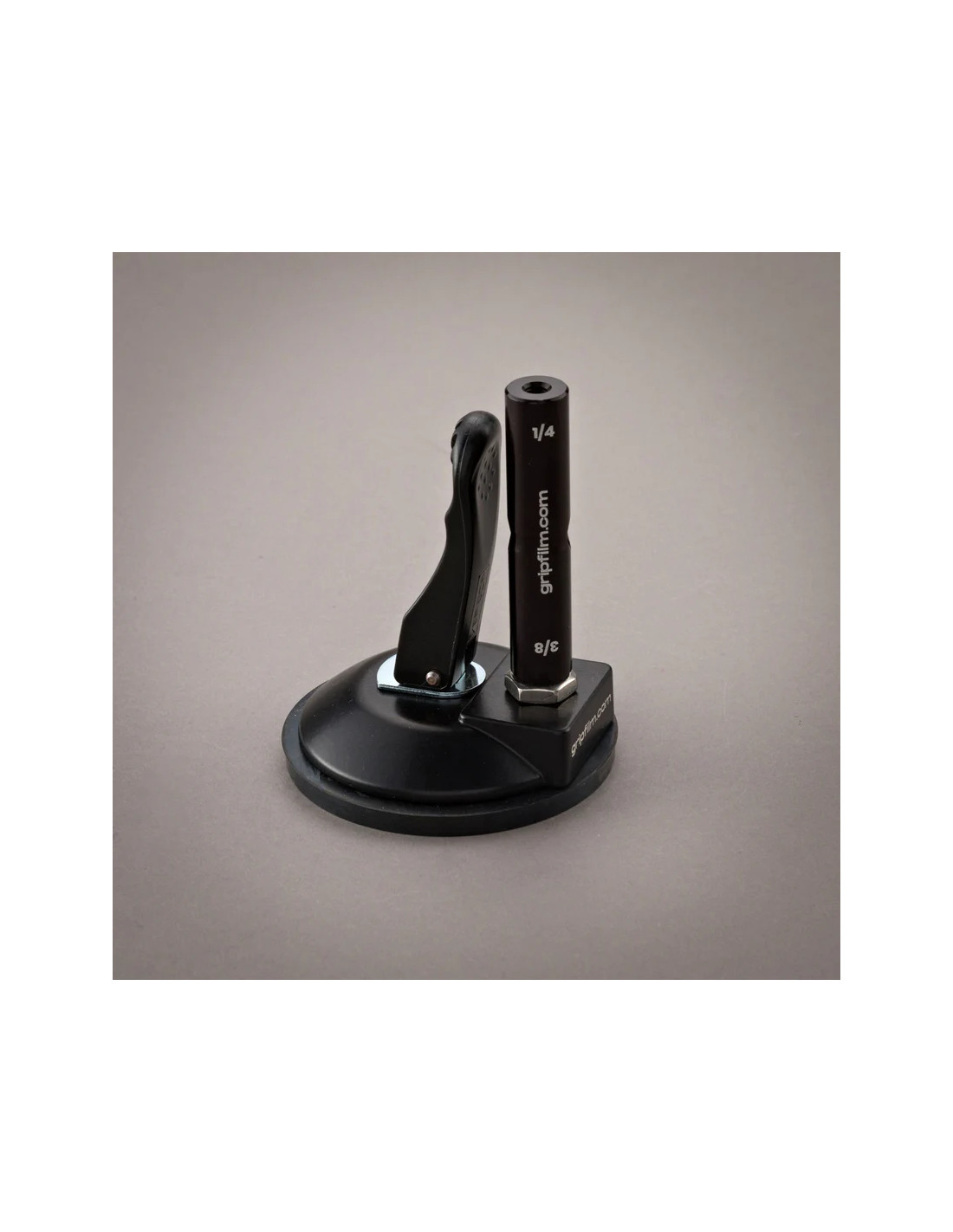La ventouse 90 mm est équipée d’une broche 16 mm (5/8") de 80 mm de long avec filetage mâle 3/8", en aluminium anodisé noir et acier inoxydable. Légère mais fiable, elle supporte jusqu’à 7,3 kg en conditions optimales (surface propre, lisse et horizontale). Grâce à ses vis de serrage en inox et à sa compacité, elle s’intègre parfaitement aux configurations grip légères. À stocker uniquement au repos, jamais activée.