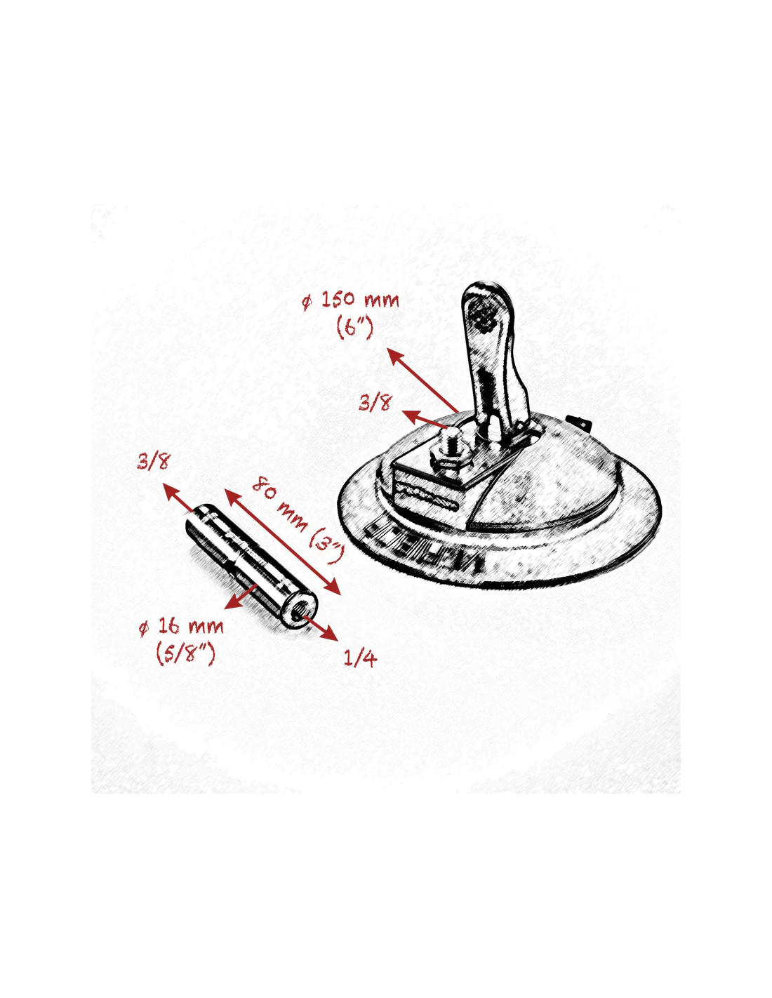 Cette ventouse de 150 mm de diamètre est équipée d’une broche de démarrage 16 mm (5/8") de 80 mm de long avec filetage mâle 3/8". Fabriquée en aluminium anodisé noir et acier inoxydable, elle garantit solidité et sécurité lors des montages caméra ou accessoires grip. Testée pour une charge maximale de 16,6 kg, elle doit être utilisée sur des surfaces lisses, propres et non poreuses pour des performances optimales. Ne jamais stocker la ventouse sous vide actif.